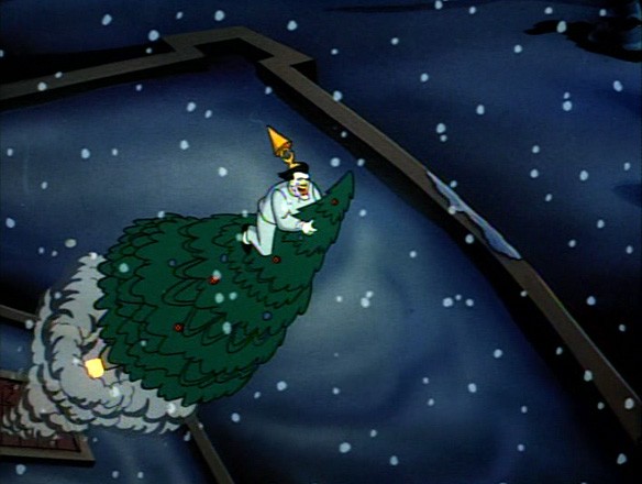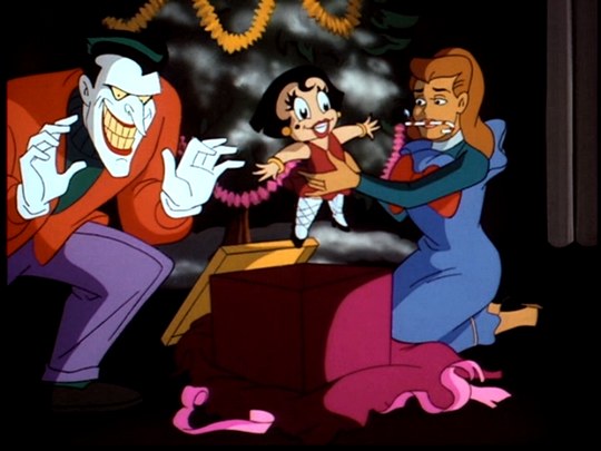 Robin (making his series debut) manages to convince a reluctant Batman that they can come home from patrolling early as it’s Christmas Eve. They sit down to watch It’s a Wonderful Life, which Batman has never seen (“I could never get past the title”), only for Joker to hijack the airwaves to taunt the Dynamic Duo with a Christmas Special.
