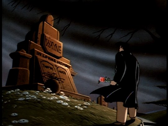 In a touching epilogue, Bruce lays a pair of flowers on his parents’ grave and walks away, his shadow stretching out behind him and taking the shape of the cape and cowl.