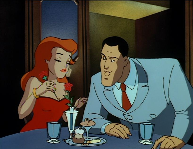 At the Rose Café, Harvey Dent and his sultry date, Pamela Isley, await Bruce Wayne. Harvey insists they order as Bruce is frequently late to engagements.