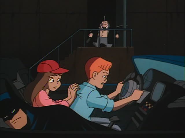 Penguin gasses him and he stumbles outside and into the Batmobile before passing out. Scared by Penguin, the kids hop in and start frantically pressing buttons. It goes from bad to worse as the kids start driving, with Sherman steering and Roberta pushing the pedals. Oh jeez.