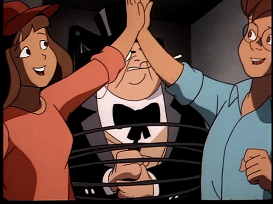 The writers weren’t really sure what to do with Penguin and it shows. They toyed with a number of concepts, including an obsession with birds and a Norman Bates style devotion to an unseen mother. The former made its way into this episode via Scrap the vulture, but ultimately they were made to follow the Batman Returns design, which I personally loathe. This isn’t really that either, though. It’s kind of a whole lot of nothing, and if you had no familiarity with the character you’d be forgiven for thinking he’s a bumbling one-off like Sewer King… save for the kids knowing who he is on sight.