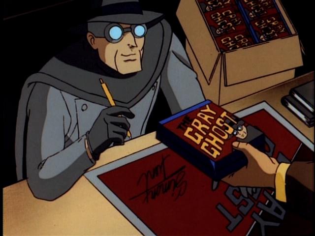 Some time later Summer Gleeson (remember her?) reports on the massively popular video release of The Gray Ghost series, with a costumed Trent signing merchandise for a huge line of fans, including Bruce Wayne. Cuuuute.