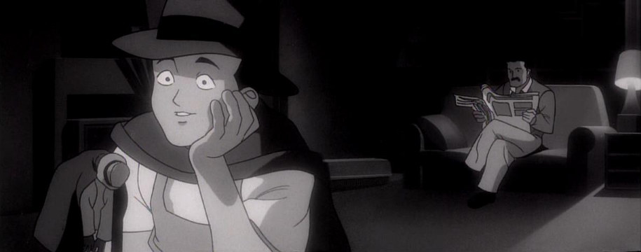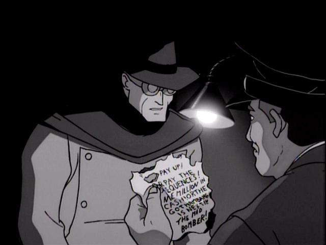 The episode begins in black and white with the opening of an episode of ‘The Gray Ghost’ called ‘The Mad Bomber’, which a young Bruce Wayne is utterly transfixed by. He’s got a little hat and a Gray Ghost doll. It’s cute as heck.