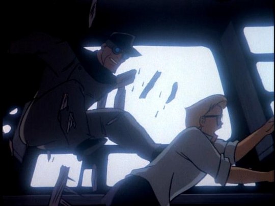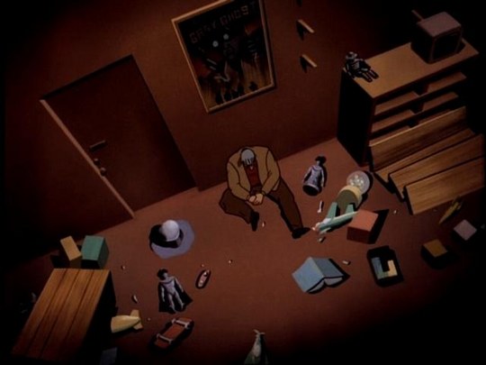 Batman confronts ‘Not Bruce Timm’, who delivers a supervillain monologue about how he needs to acquire more toys. In true The Incredibles fashion it was all a ploy on the part of the heroes, and Gray Ghost bursts through the window to take him down.
