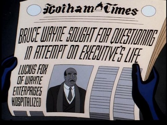 Batman hears gunshots and swoops in to save Fox. Unfortunately Lucius tells the police Bruce Wayne was responsible as Bats flees the scene.