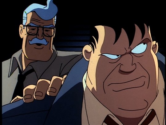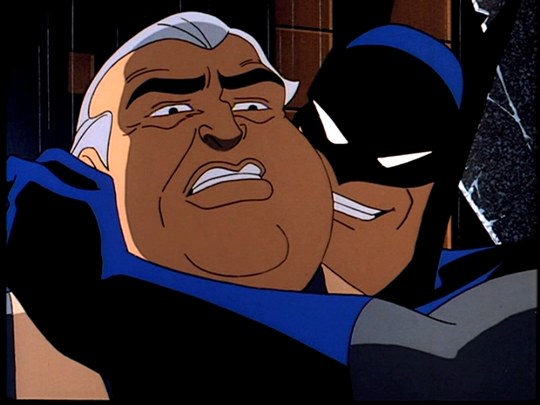Much like the other Harvey in the Two-Face episodes, they utilised the continuity they’d established with a supporting character in previous episodes and turned the spotlight on him. Bullock has been antagonistic towards Batman throughout the series, and he has been shown as formerly dirty in other media, so not only is it believable that he’d be the primary suspect for the bombing and kidnappings, it makes for an interesting exploration of his character.