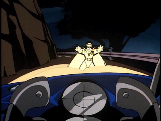 Realising Scarecrow is behind the caper (we heard his voice over Torchy’s radio but Batman didn’t), Bruce raced towards Arkham but hallucinated Robin standing in the middle of the road and crashed trying to avoid him.
