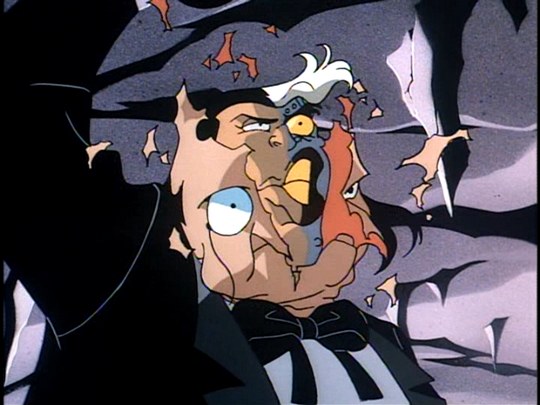 They’re always appreciated from an artistic standpoint of course, lending themselves to some of the most compelling visuals to date, including Crime Alley turning into a giant gun and a parade of enormous villains transforming into each other. A lovely touch sees Two-Face toss a buzzsaw at him, and though he ducks, we see nothing fly past him, giving a contrast between what he sees and what is actually happening.