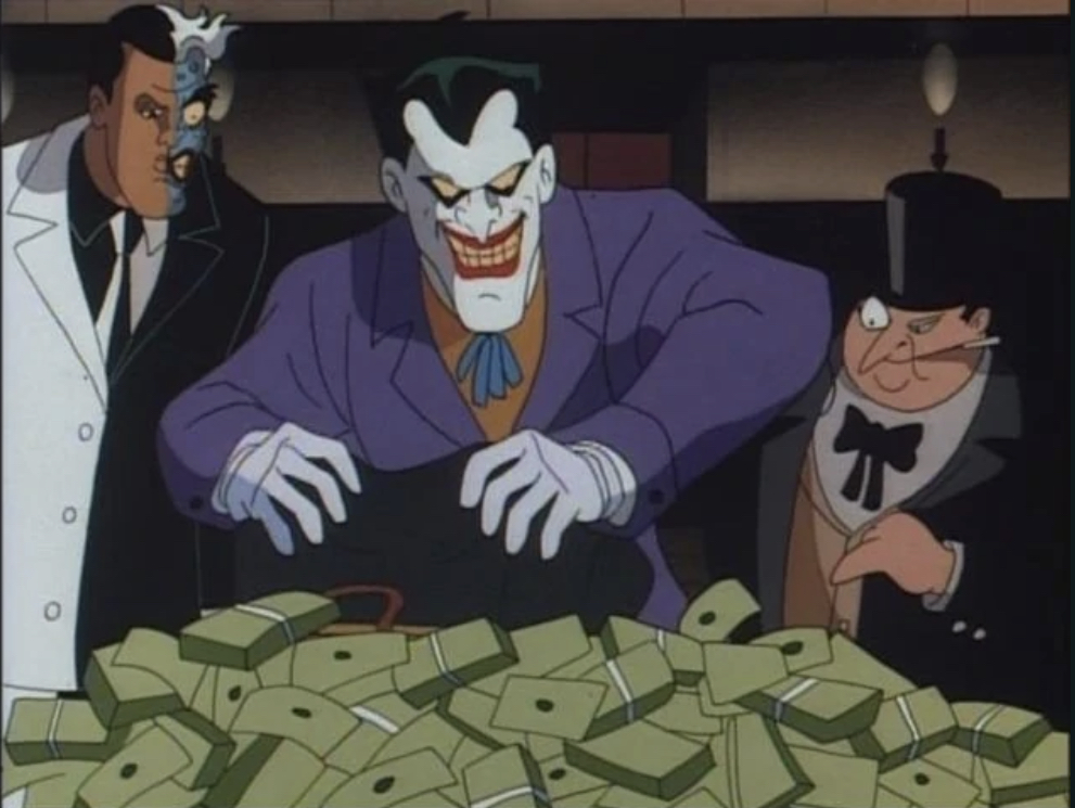 His place in relation to the other villains is one of humour, looking down on but ultimately being terrified of them. Once again, I begrudge none of the antagonists who want to get rich quick, but the fact that he poses zero physical threat once rumbled knocks him down a peg or two, as he’s treated as an ordinary civilian who stands no chance against the Murder Clown.