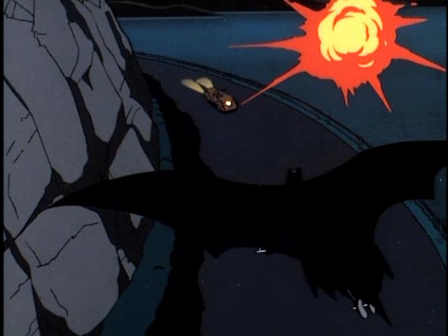 Batman does his best to give chase with a glider, but the car detects him and begins shooting a comical number of guns and missiles, sending Bats careening into the water below.