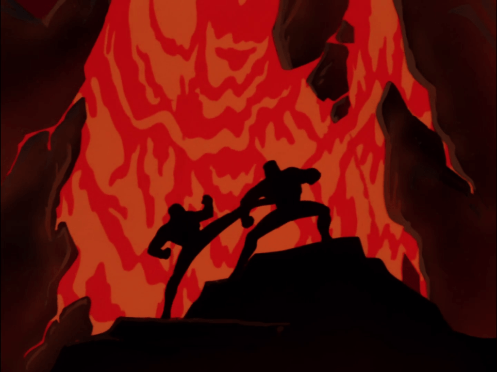 The rock formation the two are standing on splits apart, leaving Ken adrift in a sea of lava. Bruce tosses a rope to him in lieu of an olive branch, but Ken kicks it away, bows and vanishes in an explosion.
