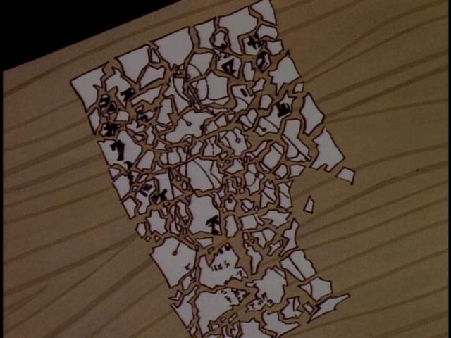 Following the map, Ken navigates the mountain (which is an active volcano!) and uncovers the ancient scroll… which disintegrates in his hands!