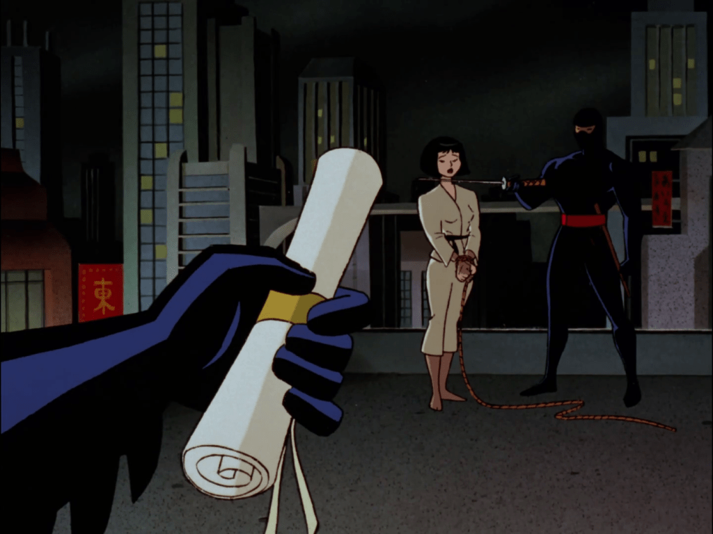 The exchange goes terribly, with Ken kicking Kairi off a freakin’ building, forcing Bats to leap over the edge after her, allowing the villain to snatch the scroll with a kunai.