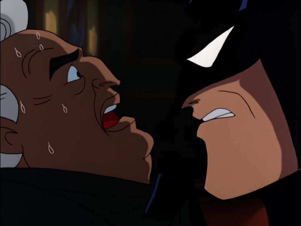 This may be the best directed episode in the series, in particular Sid’s retelling of his triumph over Batman. From the staging of Batman’s arrival to the slapstick fight that makes it seem to onlookers as though Sid is beating him up, to the all-important unbelievable yet totally believable circumstances of the fall, it’s a masterclass in visual storytelling. Harley and Joker emerge from shadows and are animated in a way that makes them appear even larger than life than usual, which conveys the degree to which Sid is in over his head.