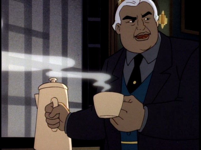 A man… is running! In the rain! He steps over a newspaper that reads “Batman Slain?” on his way to see Rupert Thorne, who is uncharacteristically nice to the bumbling fool.