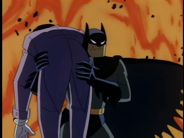 Batman, having escaped certain death yet again, joins the fray, allowing the ladies to escape while the men burn the whole place down. Batman rescues Joker from the flames so he can lock him up. Urgh.