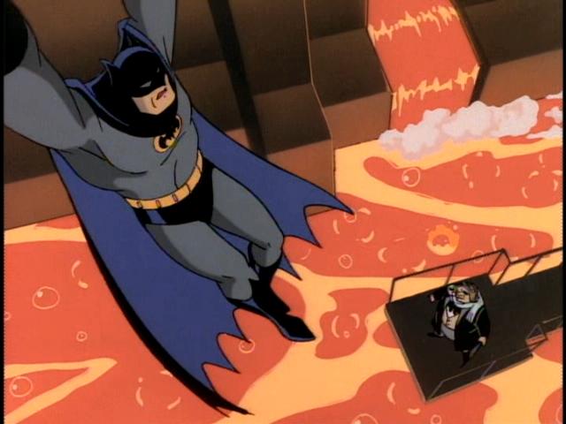 Cornered in a smelting chamber, Bruce realises he’s clinging onto a water pipe and opens a valve, creating a massive updraft of steam. Following his ears to Penguin’s coughing fit, he takes Cobblepot down and hogties him.