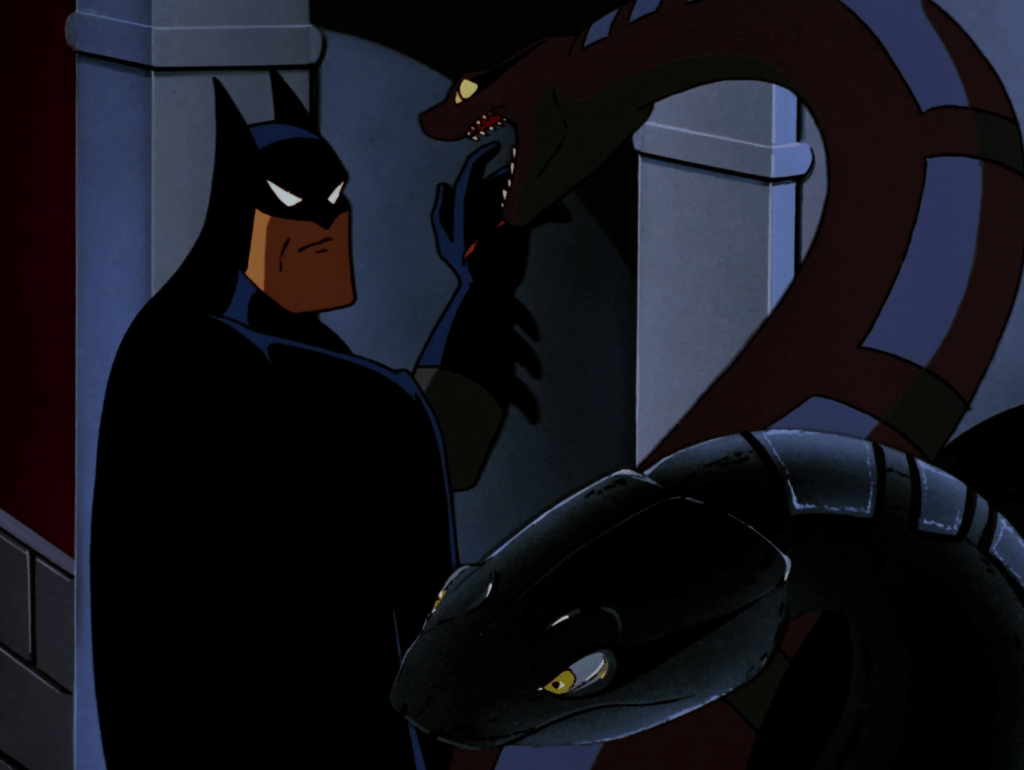 Batman is discovered and dropped into a chamber containing ‘twelve’ labours. The first? A hydra… Or rather one real snake wrapped around a statue of two more, giving the impression of a three-headed creature. Batman sprays it with knockout gas.