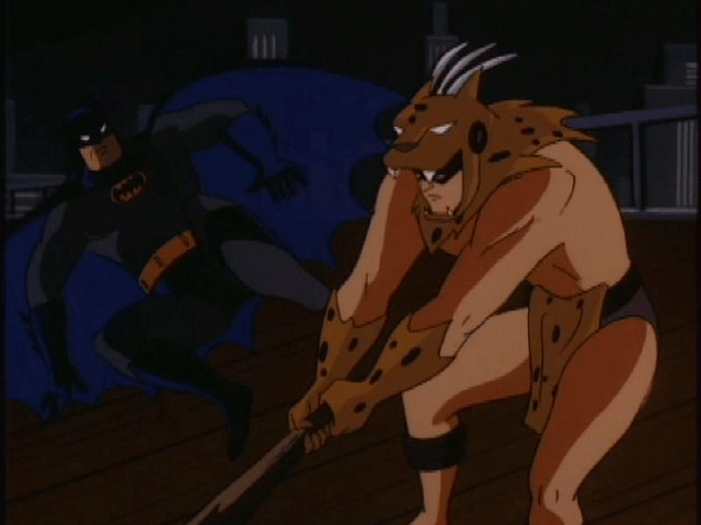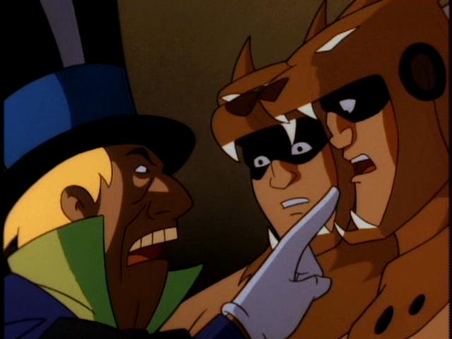 It gets better! The head henchman from the start of the episode with the more elaborate outfit is a legitimate native of the unspecified village, who Tetch brainwashed into leading a group of Gotham randoms, all costumed by Tetch. Woof.