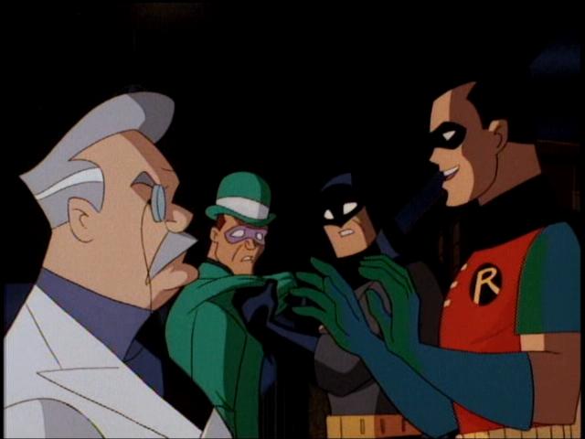 Bruce later delights in telling Dick that he survived the explosion by hiding inside a safe. The episode ends with Riddler in Arkham deliriously screaming over and over that he HAS to know.