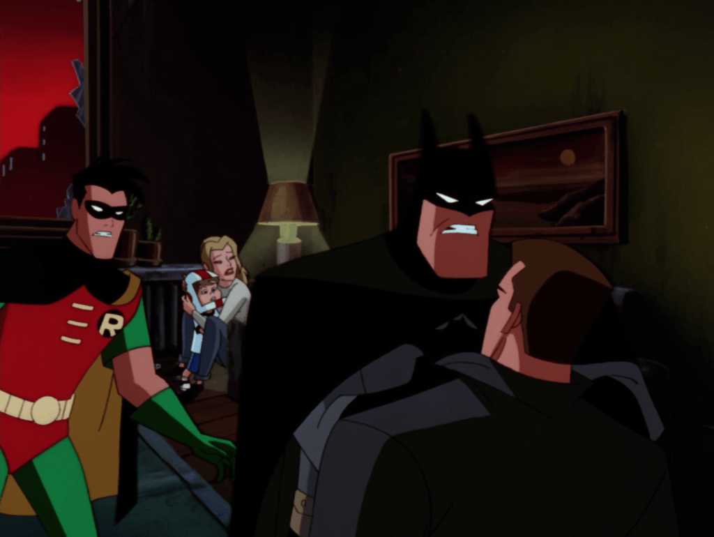 Chasing down one of Joker’s henchmen, Bruce is a little too brutal with him in front of his wife and young son. Dick pleads for him to ease up and then splits when he refuses.