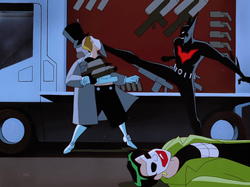 A group of Jokerz attempt to buy firearms but Batman intervenes, taking them all out and setting the dealer’s truck alight. Bruce congratulates him but then sasses him about being sleepy from all the late nights.