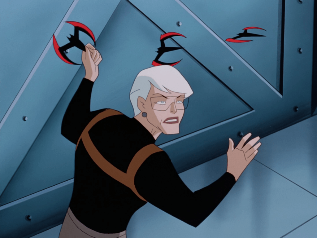 By overcoming a ridiculous numbers disadvantage, cutting scores of guards to pieces, and very nearly hitting her mark if not for Batman and some trickery, she gets to remain looking strong despite essentially failing three times. And in a setting where everybody is armed with crazy future tech, her throwback methods let her stand out. Plus, ya know, swords are cool. I also enjoy the touch with her face being exposed to Terry but not the audience, giving her an added layer of mystery.