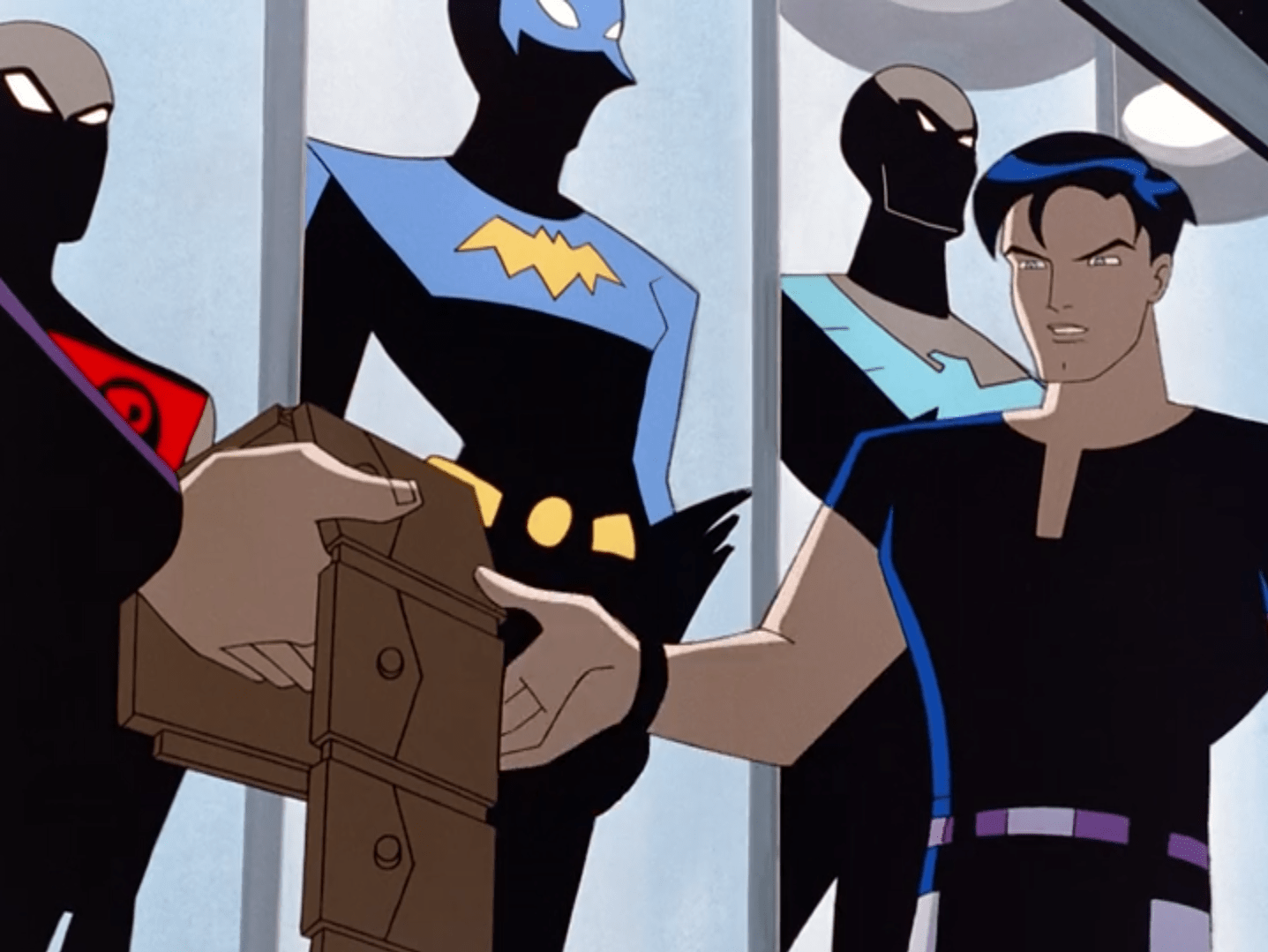 Terry endeavours to go to the Vance building and shut the program down, so Bruce offers him the utility belt from his old suit for protection. Terry adds Nightwing’s domino mask for effect. Aww.