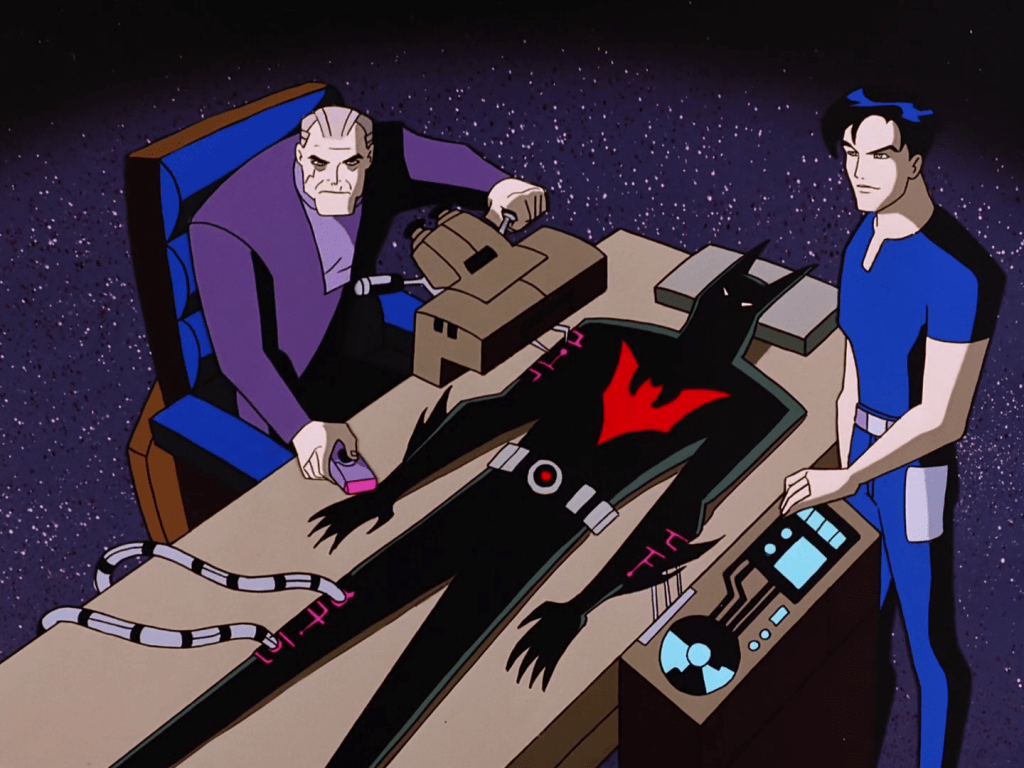 In classic Bruce Wayne style, he simply cannot be bothered to reprogram the suit, so he and Terry leave the task for later. Naturally, the suit sits up under its own power as soon as they leave. Worse, our heroes discover it disabled the remote override on its way out.