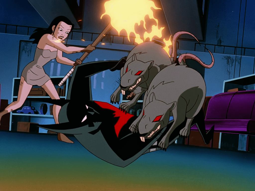 What that leaves you with is an excessive amount of Dana in a tiny white dress, which is torn and dirtied during her ill-fated and surprisingly lengthy escape attempt. Then Batman just saves her out of nowhere. It feels skeezy in a way this show hasn’t so far. Ideally, this would have been her long-overdue breakout episode where she takes the spotlight and runs with it, proving she’s a character in her own right and not just Terry’s girlfriend he drops every time Ten returns to Gotham. But alas, no, this cycle will continue, and she will not get to be a three dimensional person.