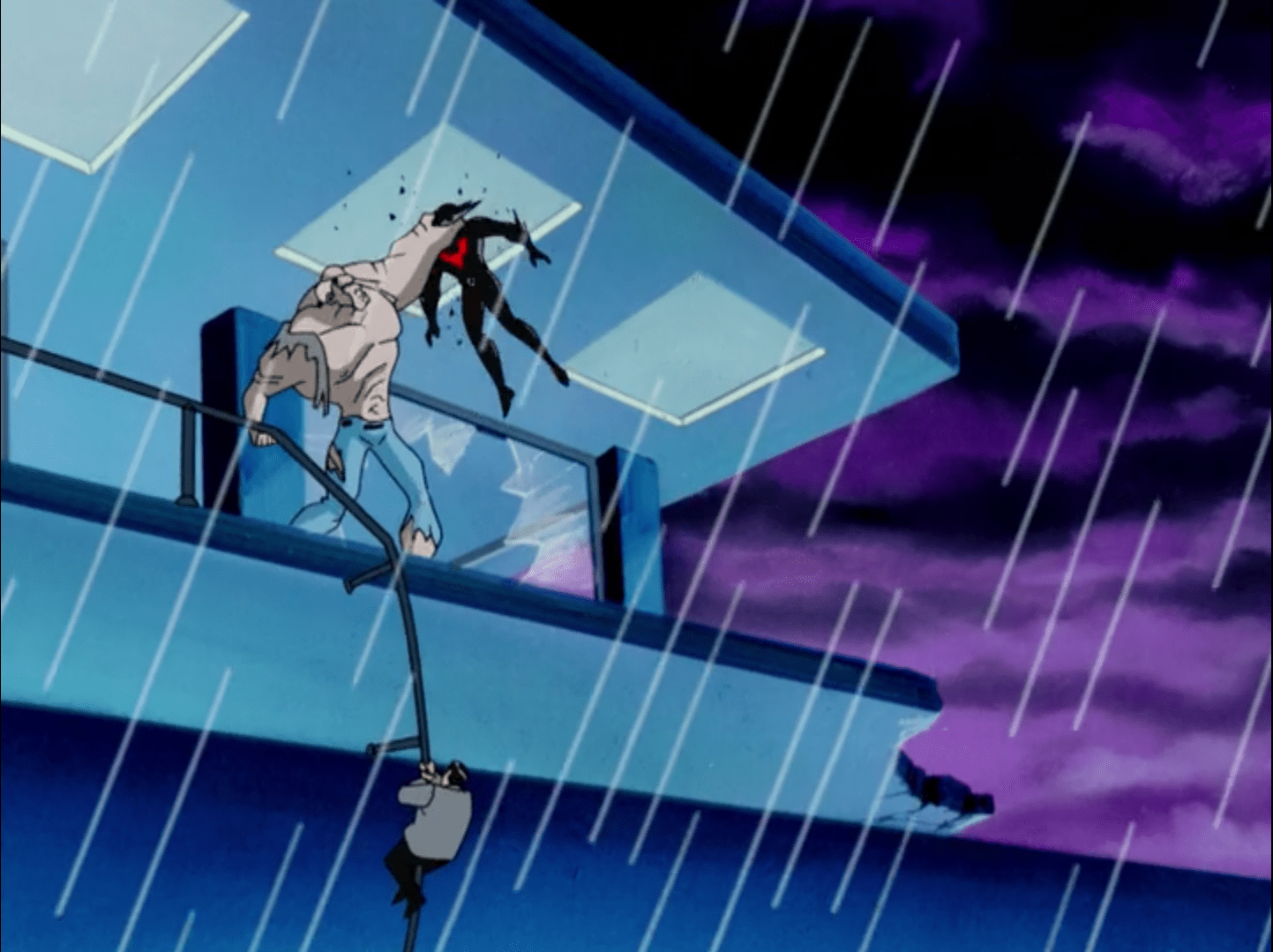 Thus we get a three-way battle between Batman, Karros and ‘Big Time’, as the brute attempts to throw Armacost to his death. Karros ends up being the one to take a big fall, which doesn’t phase Terry at all for some reason.
