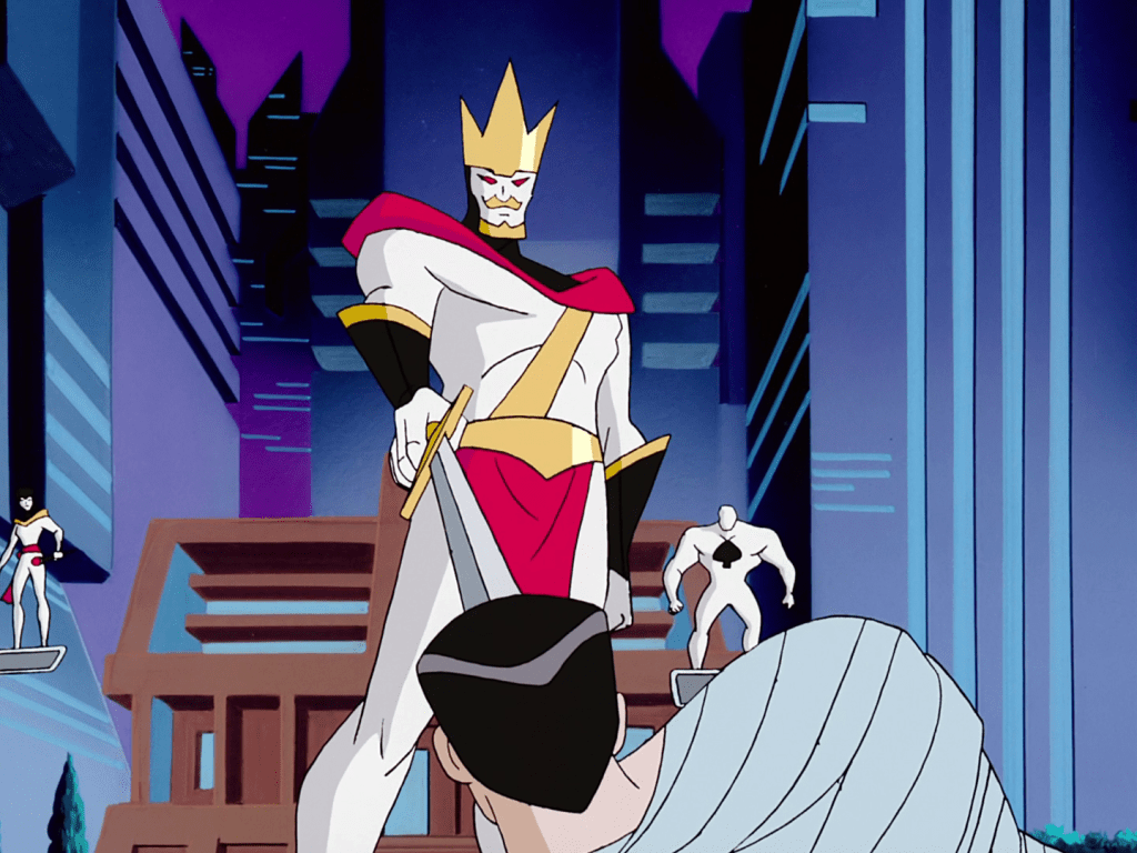 But it’s King that rises to truly great heights by being a premiere scoundrel, stepping out on his wife with Paxton Powers’ assistant/masseuse/bodyguard, and playing everybody against each other. Even without that, he abandons Jack and Queen at different points in the episode AND fights Bruce for a bit, blissfully ignorant to the fact he’s making good on his desire to get revenge on Batman after all these years. There’s even the subplot about King never measuring up to his predecessor (Queen’s father) to emphasise the generational gimmick of the group.