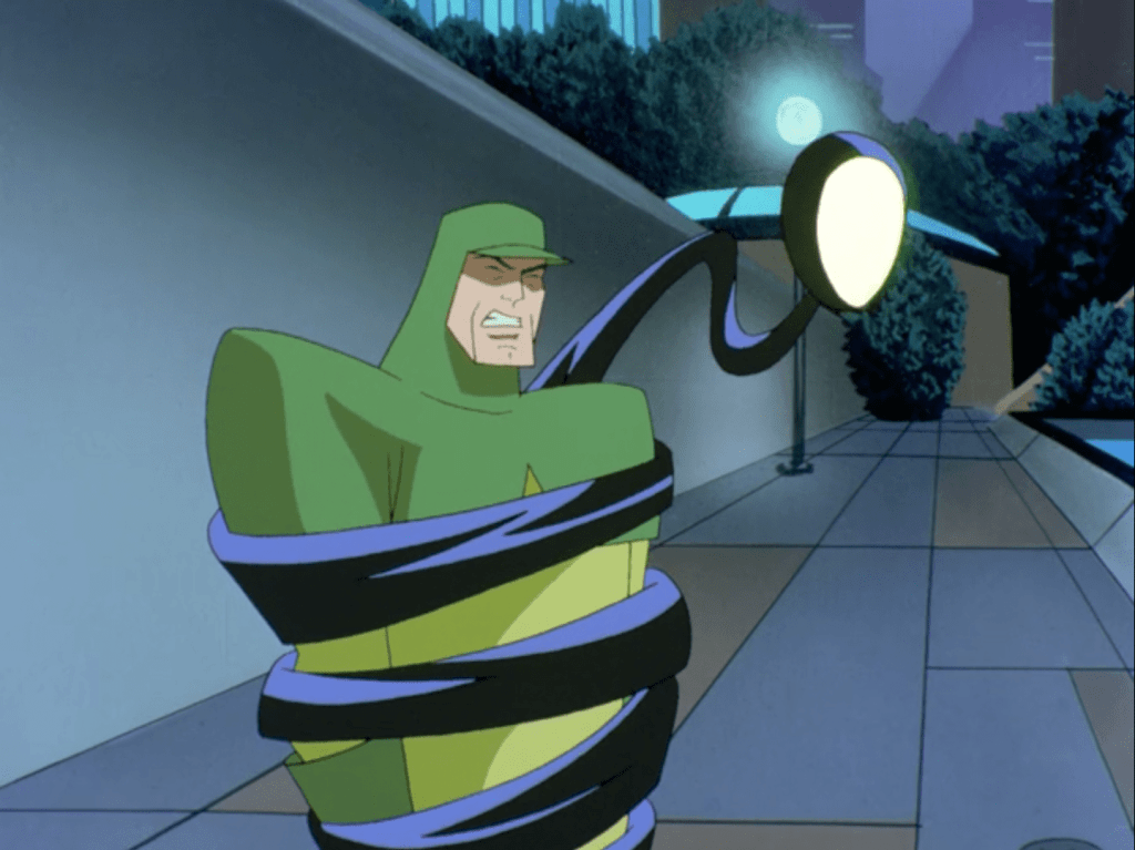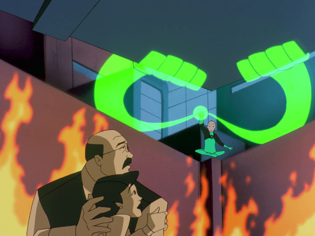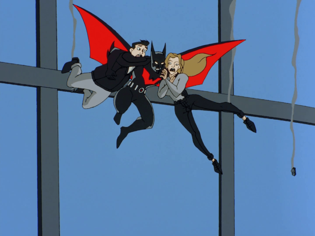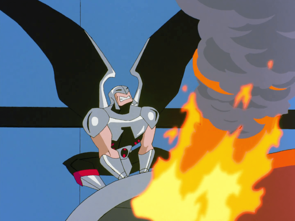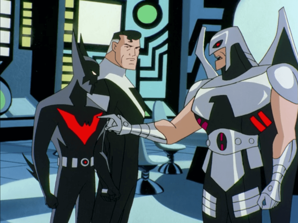 We have Micron, a size-changer akin to The Atom, Mareena aka Aquagirl, the daughter of Aquaman and Mera, Kai-Ro, a Tibetan monk Green Lantern, Warhawk (later revealed as the son of Hawkgirl and John Stewart), and Big Barda, who appears instead of Wonder Woman due to weird licensing issues. Every one of these designs rules, and their diverse mix of powers and abilities make for some bombastic spectacle that makes Terry and his advanced Batsuit seem almost redundant by comparison. Normally that would be a complaint, but we’re talking about entire buildings falling over left and right, which is a legitimately exciting sequence that acts as a proof of concept for the then-upcoming Justice League cartoons.