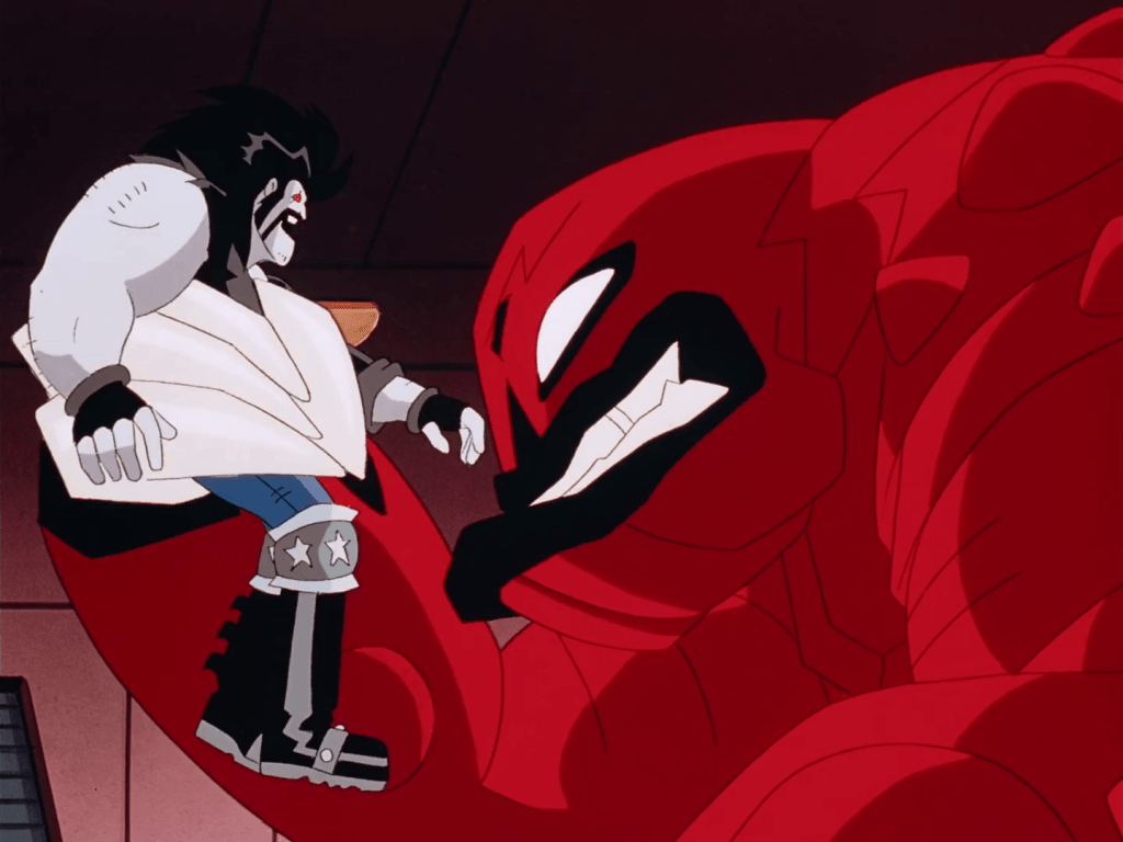 Lobo briefly wields a chain with a metal hook on the end near the end of the episode. This is generally his signature weapon in the comics but was deemed a smidge too violent for the cartoon, so is saved for this one non-violent usage.