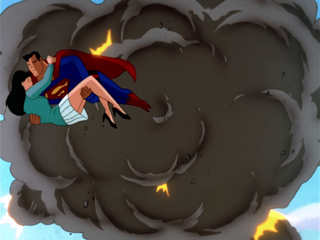 Lois wins an investigative journalism award but is a little shaken due to a death threat written on her napkin. Sure enough, Clark spots a trap above the stage and excuses himself so he can swoop in as Superman and save her from being crushed to death.