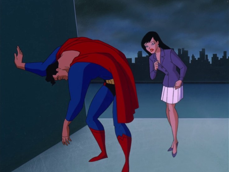 Visually it’s one of the better episodes in the series to date, predominantly due to Lois puzzling out the invisible building thanks to a pigeon sitting on nothing, opening a door out of thin air and then closing it behind them. Likewise the various illusions let them mix things up a bit, from the saloon and pirate ship to the mostly re-used train yard. The constant red sky is unpleasant, but that’s by design. Also it reminded me of how much I hate the red sky in The New Batman Adventures. Luminus’ powers in general end up looking pretty great, with a slightly different representation of invisibility than you typically see, as well as all the lasers and copies. I can’t really articulate it properly, but there’s something extremely clean about the way Lytener was punching Superman right at the end when he thought he could finish the Man of Steel before his powers came back. See below.