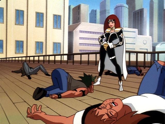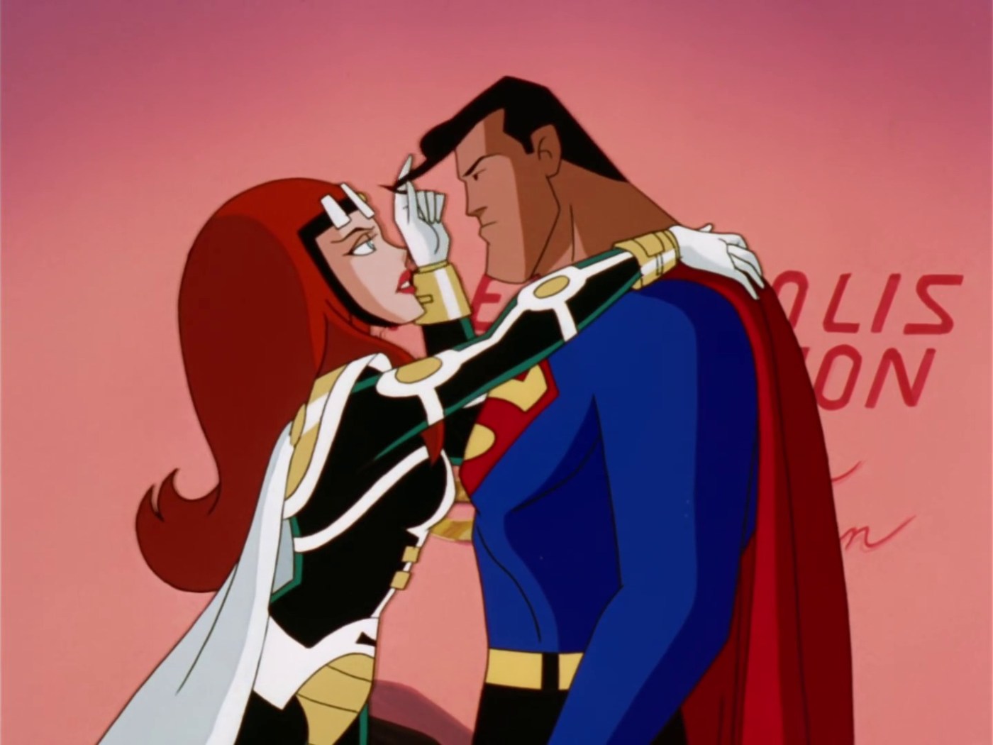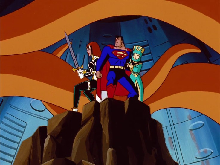 Above all else there’s just so many outlandish lines of dialogue that had me pausing to do an ugly laugh, mostly from Queen “No one has ever lasted this long with me” Maxima. The entire thing is so tongue in cheek, including multiple cutaways to a nosy neighbour being told off by her husband as she provides horny running commentary on Superman & Maxima’s fight. The old lady asking what planet Superman is from when he describes a marriage based on equality and respect slayed me. Not because it’s terribly inventive writing, but more how ballsy it is to deploy that brand of sitcom writing in the middle of what’s ostensibly a space opera episode of Superman. I also really enjoyed Maxima solving Angela Chen’s worries about needing to fill time on her segment and am left wondering why Angela hasn’t been a bigger part of the show. That also applies to the Daily Planet crew. Hell, even Superman sarcastically asking if Maxima is sure she’s a Queen when they get arrested by her own guards got a chuckle from me. Is this the funniest episode in the DCAU? Maybe!