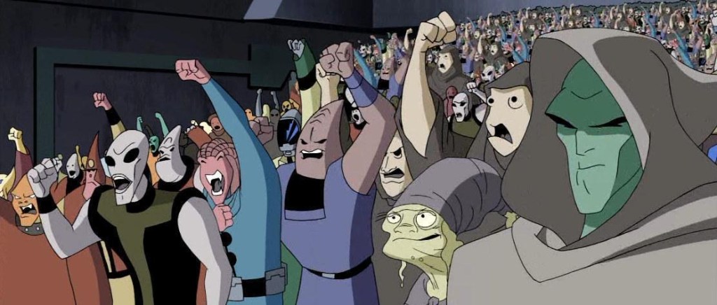 The B-Story is Green Lantern and Hawkgirl following the trail towards War World. They bicker and do the cop routine on a variety of aliens. It’s not terribly interesting, even when you know where they’re taking these two characters. I just find John Stewart unlikeable more often than not, particularly when he’s directly opposed to anyone that isn’t explicitly villainous. You can chalk it up to his military background if you want, but that’s not going to help someone like me not think he’s simply being a dick 90% of the time. He was in no position to assess Shayera’s guilt for the opening incident, and is a hypocrite for scolding her over her heavy interrogations given he behaves the exact same way. On paper that may sound like some cute romantic tension, but given the context I can’t really enjoy it from that side either. It’s all just very autopilot stuff. Oh, and J’onn walks around in a cloak to hide his identity, helplessly watching Clark’s fight. Also nothing.