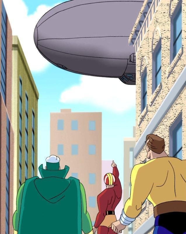 He chooses a daring robbery and escape by blimp, because why not? The shorthanded Justice Guild struggle at first, but reinforcements arrive and they eventually capture their foes.