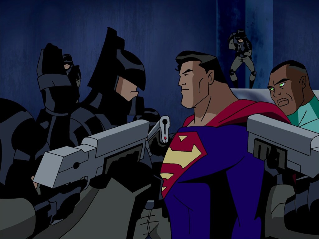 I’m glad they decided to start the episode in an alternate present so we could see the long-term ramifications of Savage winning the war for Germany, before taking us back to the 1940s so the team could directly participate. (Sick colour and shape warping during the time travel sequence too!) They could easily have had the League tumble through an energy storm on the way home and go straight to the alternate past, but then we’d have missed out on Resistance Leader Batman. I really like his alternate costume, his similarly dressed band of followers, and him simultaneously being higher and lower tech than the version we’re used to. This is way more appealing to me than Thomas Wayne using pistols and incorporating red into his colour scheme. The tragedy of Alternate Bruce optimistically hoping that reversing the changes to history could save his parents is brutal, especially as Superman (and ostensibly only Superman based on events of the show) knows for definite they’re fated to die either way.