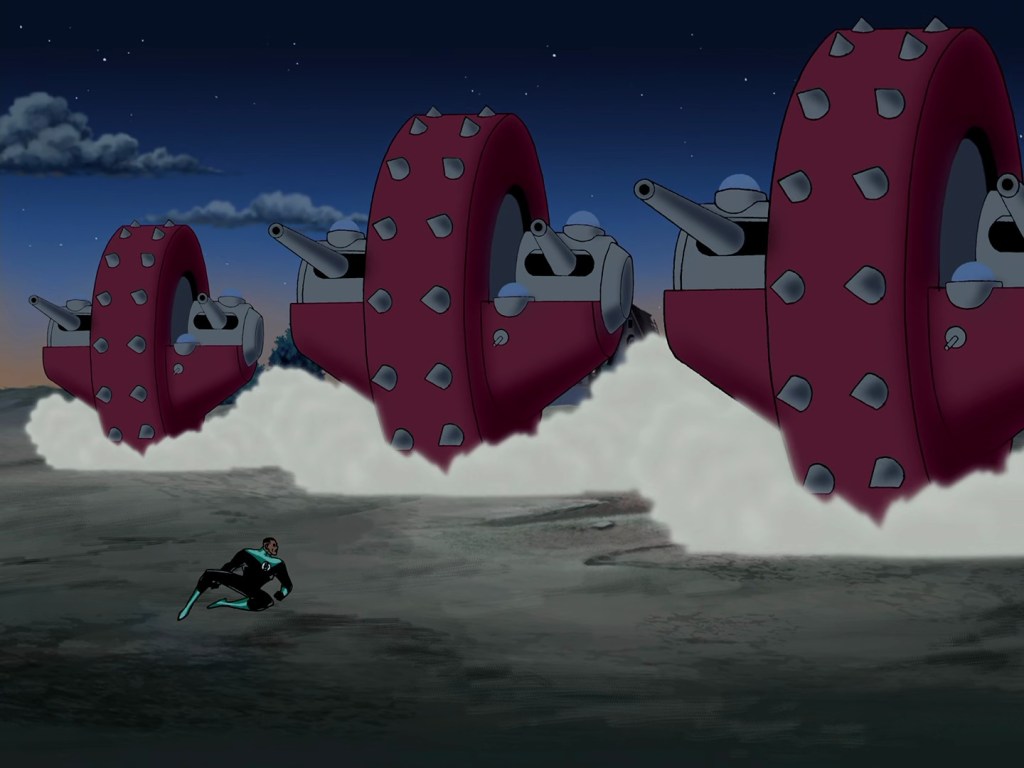 Back in France, the strain of battle causes Green Lantern’s ring to finally run out of battery, leaving him a sitting duck as one of Savage’s ‘War Wheels’ descends upon him…