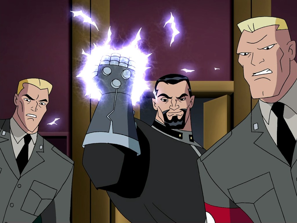 The idea of these episodes being a child’s first exposure to World War II is deeply funny to me for some reason. In fairness it is pretty shocking to see such a major historical event depicted in a cartoon, even with them having to toss in sci-fi elements and be careful about depicting death on screen. There’s simply an inherent power to all of this imagery that I think they ultimately do a good job wielding, with tanks rolling down decimated European towns and whatnot. I would imagine the art team probably had a decent amount of fun with the aesthetic of both time periods (love the hand around the The Daily Planet’s globe monument), and the voice cast all got to do their worst German accents to play random soldiers. The various action scenes feel weightier than the typical ones too, likely due to the setting. While none of our regulars are ever in any danger and they’re never going to show the slaughter of soldiers or civilians on screen, there is a baked-in understanding that a lot of people are dying just off-camera at all times. Plus the sheer scale of it means that with or without Savage’s enhanced tech, the League would struggle to turn back an entire invading army, so the stakes are enormous.