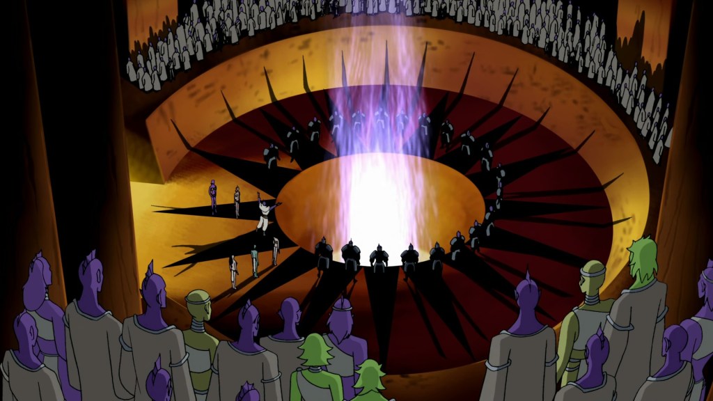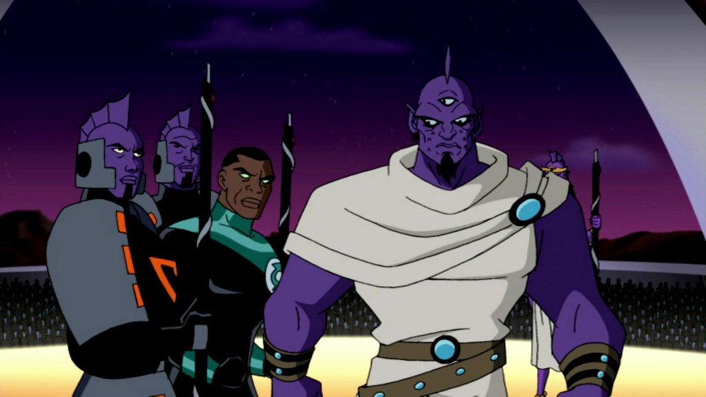 The intense first scene was one of the better cold opens in the series to date, immediately conveying the power of Despero’s cult given how much we’ve seen John Stewart achieve solo. Four Lanterns being powerless against the group is just a huge statement, though they take some clever artistic license by having Katma Tui be able to fend off a dozen of the attackers when a single one of them was able to breach a shield conjured by Kilowog and Galius Zed. That’s not a criticism; it makes Katma look like a complete badass.