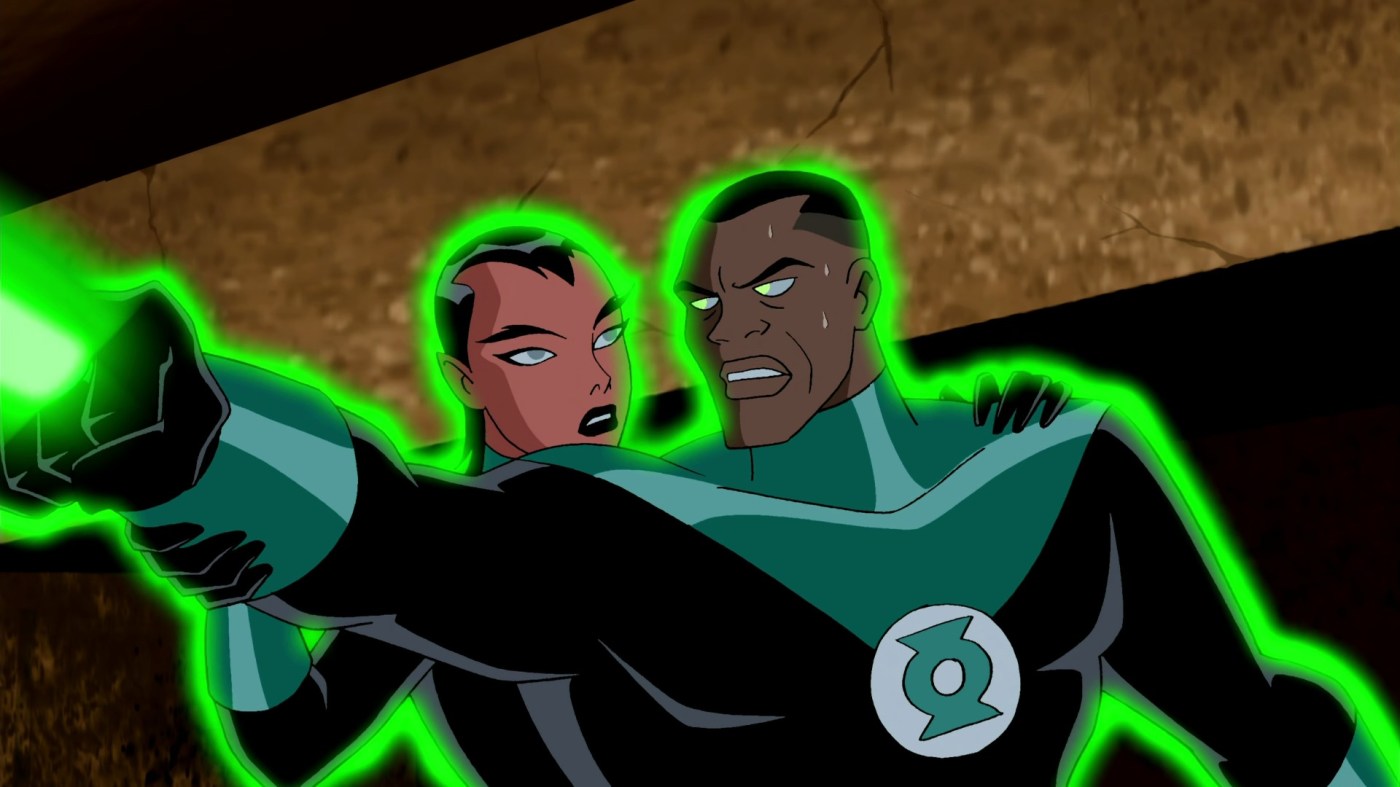 Katma Tui verbally acknowledges Kyle Rayner, the first Green Lantern to appear in the DCAU (well, I guess Abin-Sur but ya know.) Kyle is allegedly off doing further training, hence John being the official GL for earth’s sector.