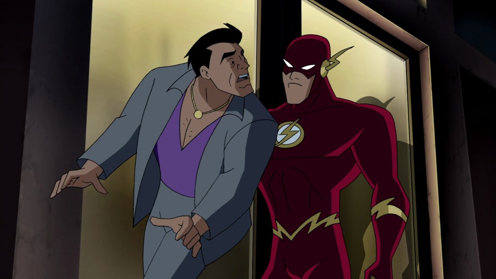 Batman catches Clayface out because of his over-egged “yo”, taken from Flash’s commercial for Lightspeed Energy Bars a couple of episodes ago.