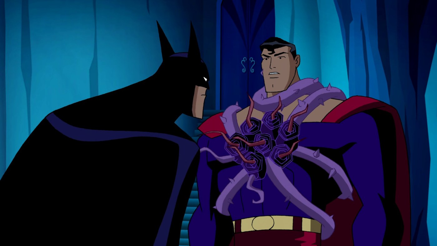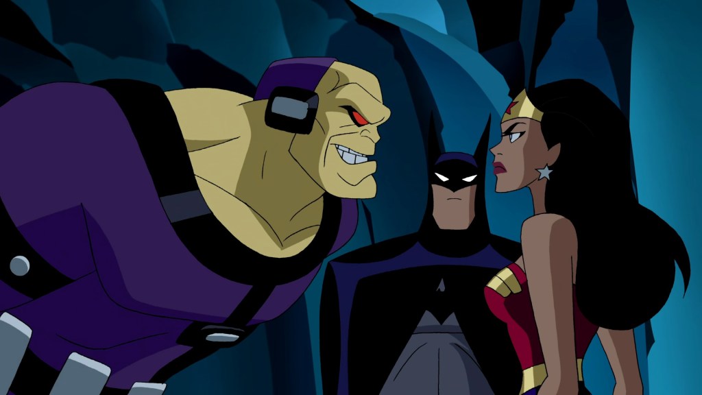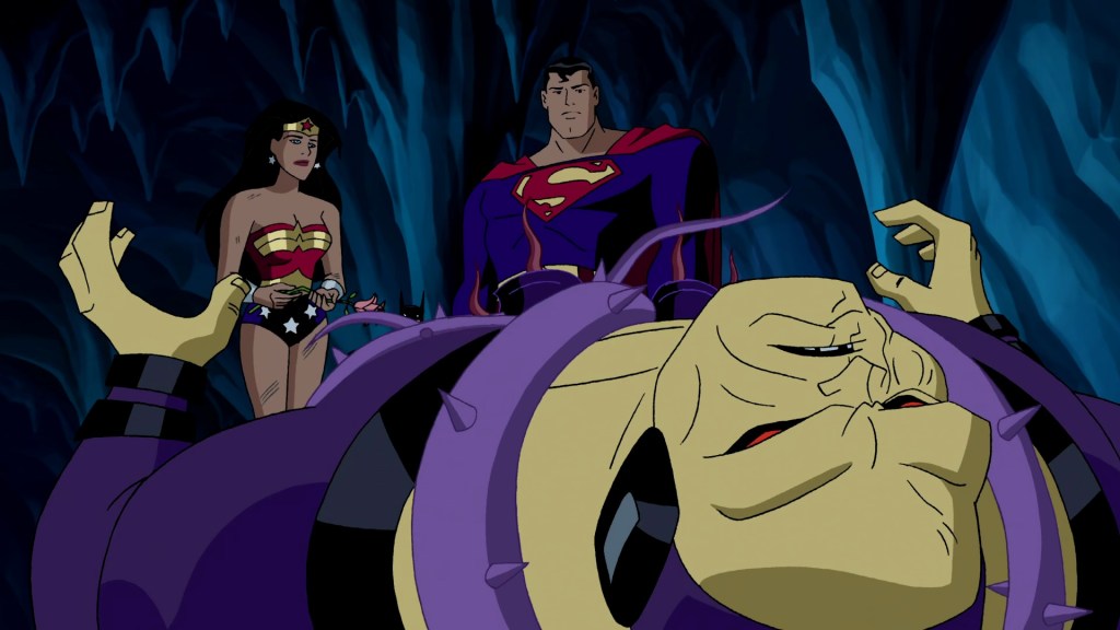 While Batman plays detective and tries to get the parasite off Clark, Diana’s role is to desperately try and beat the snot out of Mongul to little avail. Their fight scenes have a legitimate sense of visceral violence beyond a good 90% of what we usually see in the DCAU. Between the plotting of their fights (brawling through various rooms in the Fortress), the music and sound effects, and Bruce’s repeated pleading to Supes, the whole thing feels so dangerous. Like Diana could actually die here.