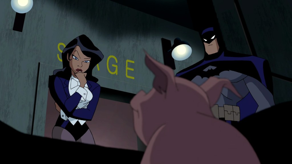 Diana wistfully looking at a parade of loved up couples and then asking Bruce if he ever wishes he could be down there having fun while he just spouts his bullshit rhetoric about The Mission is a lil tragic. It’s actually a really nice little character study for Diana, who goes from sadness and frustration as she grills him, to playing with her hair and gently poking fun at his moodiness, before finally responding to his claims that having someone close to him would be dangerous by flexing her overwhelming power. If ever Bruce wouldn’t have to worry about someone being able to protect themselves, it would surely be the Amazon Princess. He then proceeds to spend the episode doting on her in pig form, demonstrating more physical affection than we’ve ever seen from him. Perhaps the absurd barrier of her no longer looking like her allows him to psychologically ‘give in’ or whatever? And then he reluctantly admits to Zatanna that they’re more than friends. Honestly, is this the WonderBat episode???