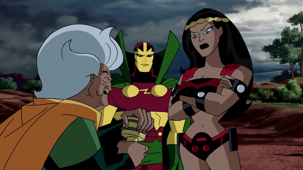 Barda made her debut in ‘The Call‘ where she filled Wonder Woman’s slot on The Justice League of the future because the rights with Diana were too complicated at the time. Mister Miracle got a tiny cameo in that same episode but was a fully-fledged member of the team in the tie-in comics.