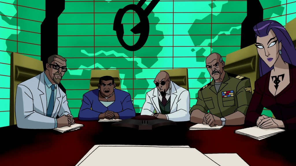 This is one of the better cold opens the show has done to date, lulling you almost to sleep as Amanda Waller goes about her morning routine – tossing in the official confirmation Lex Luthor is running for President for some long-term continuity – and then having Batman suddenly appear for a little chat. It also serves to tie together some threads, with the events of ‘A Better World‘ and the reveal in ‘Dark Heart‘ that The Watchtower has weapons capability spooking her, leading to the creation of The Ultimen and Galatea. They even tie all of this to Lex assisting General Hardcastle in ‘Legacy‘, and even a link between Dr. Milo and Kirk Langstrom. I don’t think the camera panning works quite as well as they want, but the idea of swapping from The League’s roundtable discussion to Cadmus’ was nice, and we get a proper roll call of the inner circle, with Waller, Professor Hamilton, General Eiling, Hugo Strange, Dr. Milo and the debuting Tala, with Lex Luthor the obvious financial backer. It’s all a very neat bit of advancing the Big Plot, verging on feeling like admin, but not quite.