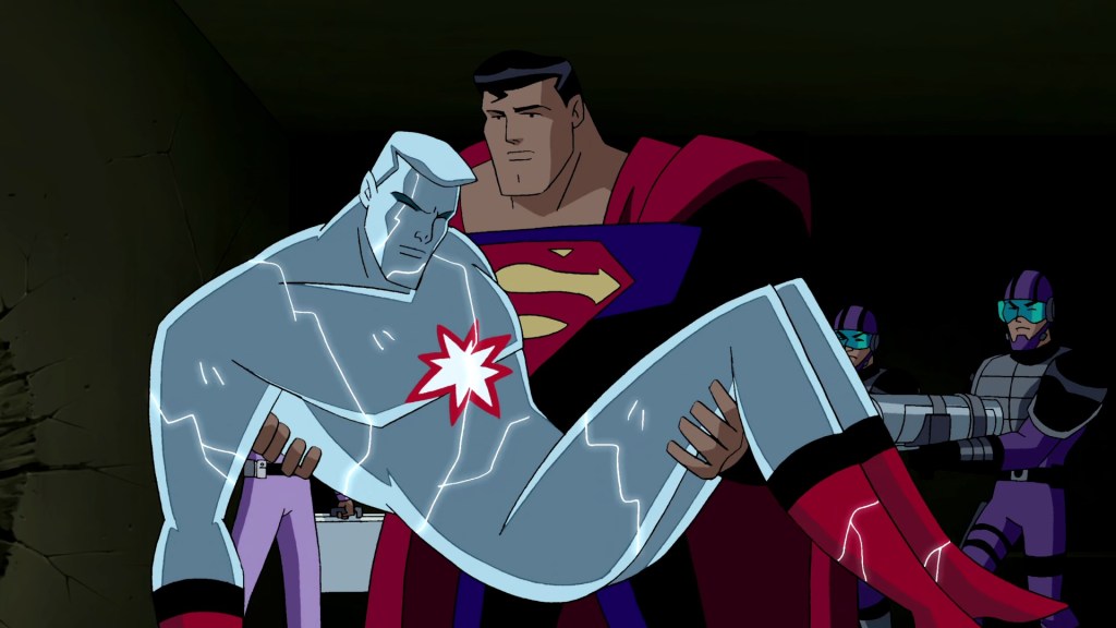 While various writers tried to communicate that Captain Atom is one of The League’s heaviest hitters (such as ‘Task Force X‘ singling him out as someone to worry about), seeing him actually throw hands with Superman and more than hold his own is still somewhat shocking. It’s a well-executed brawl as they really lay into each other in brutal fashion, levelling much of the Cadmus facility in the process (big fan of Huntress giving up on picking a lock when they blow a hole in the wall.) Lolita Ritmanis’ score really shines here, giving the whole thing a somber, almost tragic feel, and it becomes clear why as it progresses beyond the sadness of teammates fighting and moves towards Captain Atom trying to push past his obvious defeat while Clark implores him to stay down. Capping the scene off with Superman angrily shooing away Cadmus medics so he can take him to The Watchtower for treatment instead was very nice… though I am painfully aware they introduced this friendship dynamic literally one episode ago. In an ideal world Captain Atom should have been given more focus through the series, but it still broadly works.